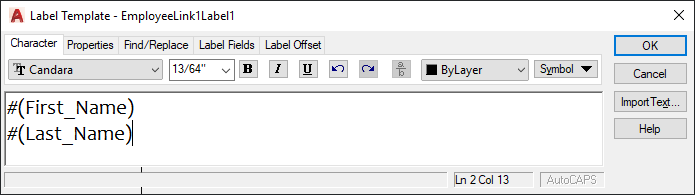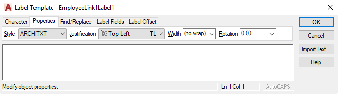 Applies a text style to the label. The current style is saved in the TEXTSTYLE system variable. Character formatting for font, height, and bold or italic attributes is overridden if you apply a new style to an existing label template. Stacking, underlining, and color attributes are retained in characters to which a new style is applied.Styles that have backward or upside-down effects are not applied. If a style defined with a vertical effect is applied to an SHX font, the text is displayed horizontally in the Label Template dialog box.