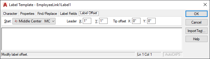 Specifies an X and Y offset for the multiline text object with respect to the associated leader object. By default, the X and Y Leader Offset options are set to 1, indicating that the label text is offset 1 unit in the X and Y planes from the tip of the leader object. The Leader Offset settings apply only to attached labels.