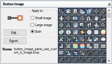 In the Button Image pane, under Apply To, select one of the three image assignment options; Small Image, Large Image, or Both. Then select the image you imported from the image list.