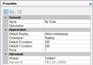 Note: Making changes to a toolbar’s properties here only affects the initial appearance of the toolbar after the customization (CUIx) file has been loaded. It is recommended to use a workspace to control the appearance of a toolbar.