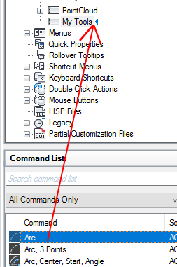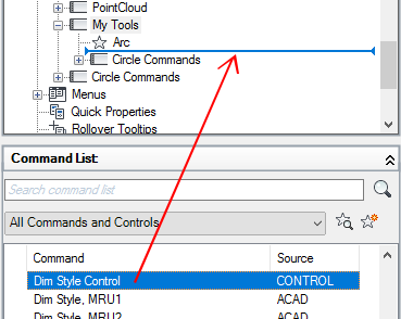 4. In the Command List pane, drag the command you want to add to the toolbar in the Customizations In <file name> pane.
