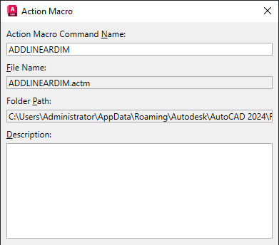 In the Action Macro dialog box, Action Macro Command Name text box, enter