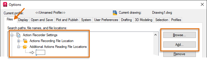 Additional Actions Reading File Locations – AutoCAD loads action macro files found in these locations as read-only, restricting edits from being made to them.