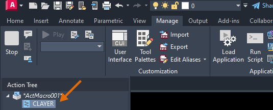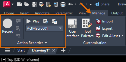 Action macros are recorded using the Action Recorder located on the Manage tab of the ribbon. Think of the Action Recorder as AutoCAD's version of an audio recorder or digital video recorder (DVR).