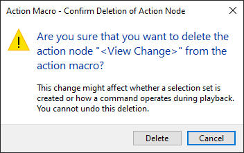 Note: If you notice a <View Change> node in your action macro, you might not need to keep it. A <View Change> node is used to restore the drawing view that was current when the macro was recorded; for example, it might be used to position the in-place text editor into view or the result of a pan/zoom operation.