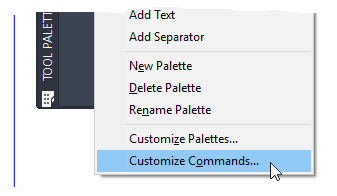 1. With the Tool Palettes window displayed, right-click its title bar or in an empty area near a tool and choose Customize Commands.