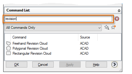 2. In the Customize User Interface (CUI) Editor, under the Command List pane, click in the Search Command List text box and type revision.