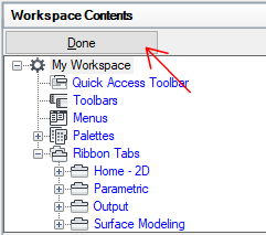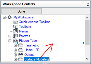 - In the Workspace Contents pane, click the plus sign (+) next to the Ribbon Tabs node to expand it.