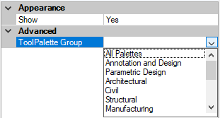 - In the ToolPalette Group box, select one of the listed tool palette groups to associate it with the ribbon tab.