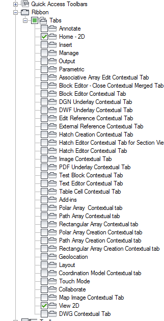- Click the check box next to each ribbon tab that you want to add to the workspace.