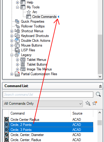 7. In the Command List pane, drag the command that you want to add to the submenu in the Customizations In <file name> pane.