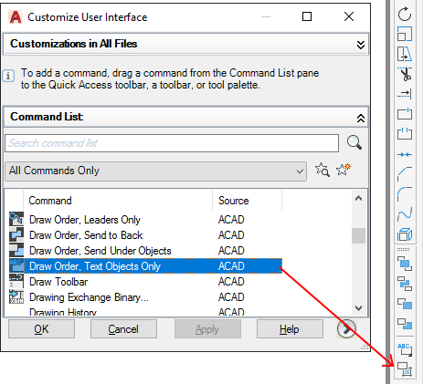 4. In the Command List pane, drag the command you want to add to the toolbar in the Customizations In <file name> pane.