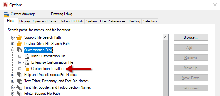 Many user interface elements display a custom image, that custom image is migrated when the command or user interface element that custom image is migrated between CUIx files. Custom images referenced by commands and user interface elements defined in a CUIx file are stored in one of two locations: inside of the CUIx file or externally in the location defined by the Custom Icon Location setting. Based on how a custom image is referenced, the process used to migrate that custom image is different.