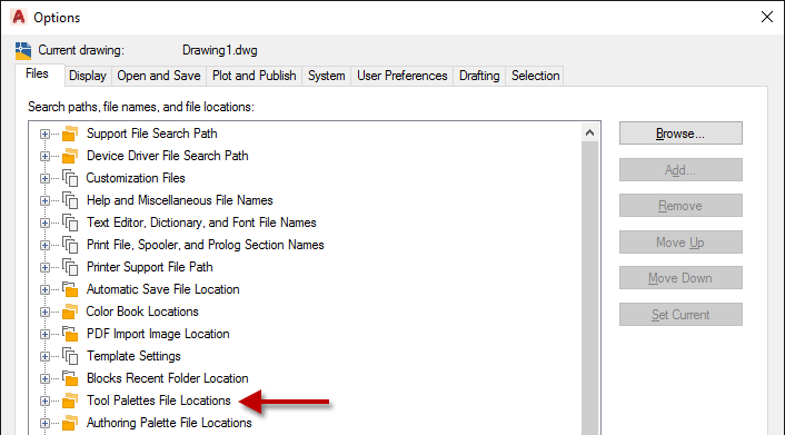 Tool palette files contain standard and user-defined tools. The files are stored in the locations specified by the Tool Palettes File Locations setting.