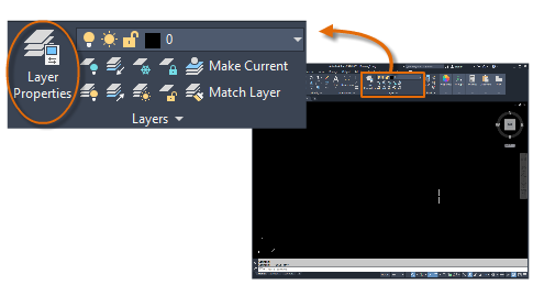 The Layer Properties Manager takes up a lot of space, and you don't always need to access all the options. For quick access to the most common layer controls, use the controls on the ribbon. When no objects are selected, the Layers panel on the Home tab displays the name of the current layer as shown here.