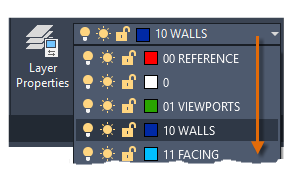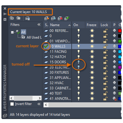As you can see in the illustration, layer 10 WALLS is the current layer. All new objects are automatically placed on that layer. In the list of layers, the green check next to layer 10 WALLS confirms that it is the current layer.