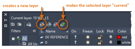 To create a new layer, click the button shown and enter the name of the new layer. To make a different layer the current one, click the layer and then click the indicated button.