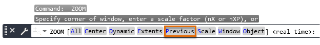 The previous view displays. Also note that typing a command or a command alias followed by pressing the Spacebar or Enter key is often abbreviated with a description like this: "Enter the ZOOM command."