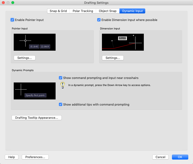Controls pointer input, dimension input, dynamic prompting, and the appearance of drafting tooltips.