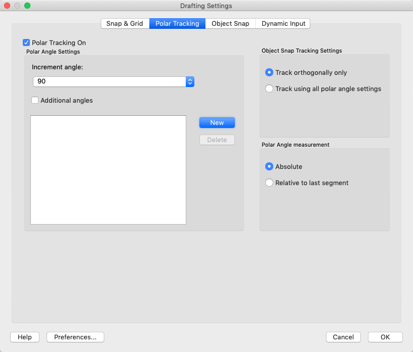 If Additional Angles is selected, lists the additional angles that are available. To add new angles, click New. To remove existing angles, click Delete. (POLARADDANG system variable)