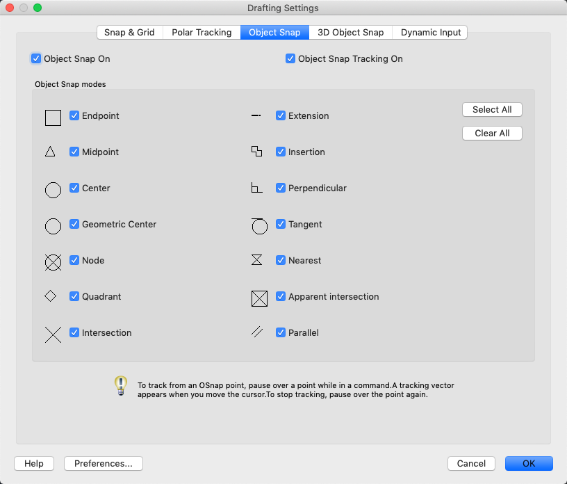 Controls running object snap settings. With running object snap settings, also called Osnap, you can specify a snap point at an exact location on an object. When more than one option is selected, the selected snap modes are applied to return a point closest to the center of the aperture box. Press TAB to cycle through the options.