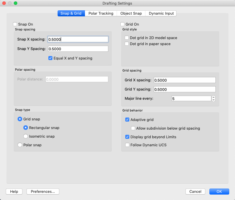 Sets the snap increment distance when PolarSnap is selected under Snap Type & Style. If this value is 0, the PolarSnap distance assumes the value for Snap X Spacing. The Polar Distance setting is used in conjunction with polar tracking and/or object snap tracking. If neither tracking feature is enabled, the Polar Distance setting has no effect. (POLARDIST system variable)