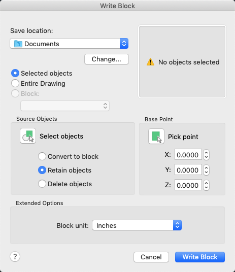 The Write Block dialog box displays different default settings depending on whether nothing is selected, a single block is selected, or objects other than blocks are selected.