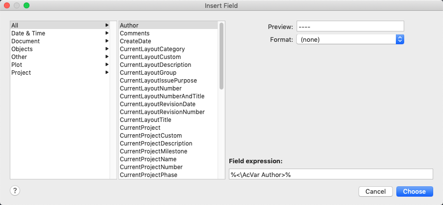 Project fields (fields that were selected from the Project category) behave differently than other types of fields. By default, other types of fields update automatically when you save the drawing or when you use REGEN. In contrast, project fields store the last values that were used, and they display these stored values if the information referenced by the project field is not accessible. To update the value in a project field, use UPDATEFIELD command.