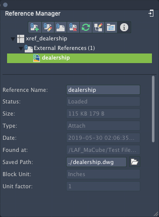 The Reference Manager palette contains a toolbar along the top. You can right-click over the files list to display a shortcut menu that allows you to attach or manage an attached external reference. Click the Show Details button on the toolbar to view details and thumbnail preview for the selected external reference.