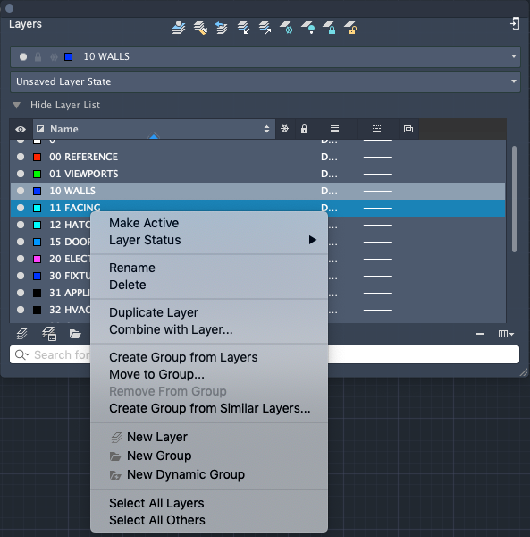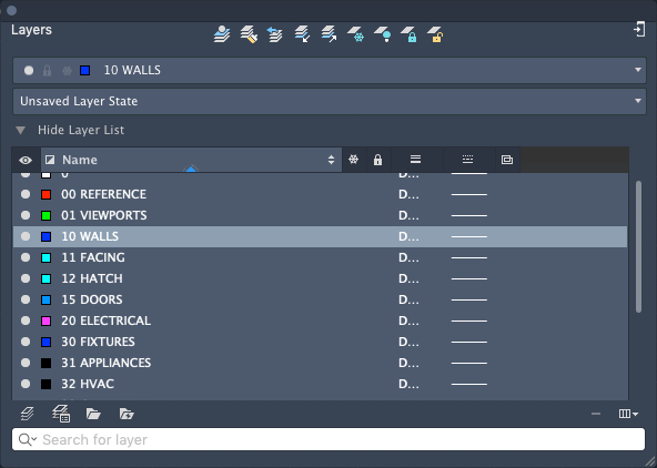 Displays a list of the layers in the drawing and their properties. You can add, delete, and rename layers, change their properties, and apply changes in realtime.