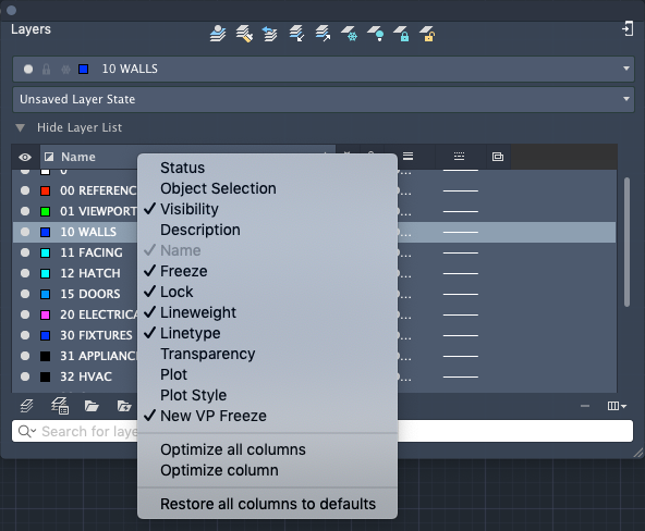 Lists all columns by name. A check mark indicates that the column is included in the display. Click a column name to display or hide the column. VP Freeze, VP Color, VP Linetype, VP Lineweight, and VP Plot Style are available only when a layout viewport is active.
