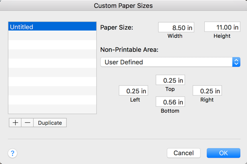 - Duplicate. Copies the selected paper size to create a custom paper size that you can edit.