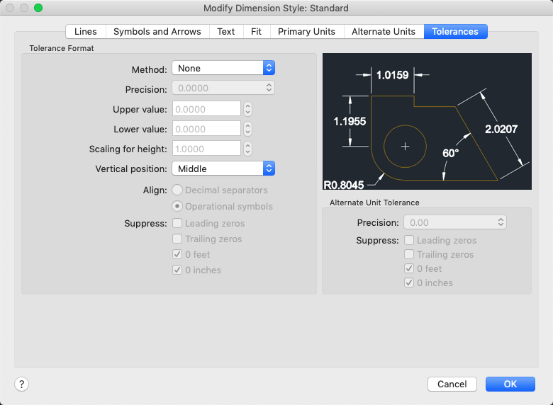 Controls the suppression of leading and trailing zeros and of feet and inches that have a value of zero. (DIMTZIN system variable)