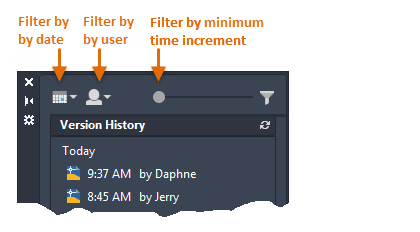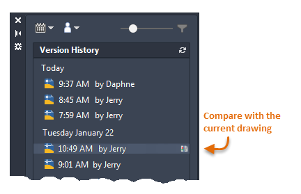 If you save drawing files to a OneDrive, Dropbox, or Box account, additional versions of these drawing files are created as you work, creating a version history. The previous versions will be listed in the new Drawing History palette so you can compare them with the current version of your drawing.