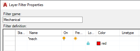 When a layer filter is selected in the Filters panel of the Layer Properties Manager, only the layers that match the properties specified in the filter are displayed in the layer list. Filtering layers reduces a long list of layers to only those that are currently relevant.