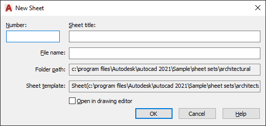 Specifies the sheet number. It is recommended that you do not fill in the sheet number when you first create a sheet. By default the drawing name and layout name of the new sheet will be the sheet number together with sheet title.