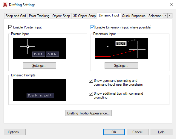Controls pointer input, dimension input, dynamic prompting, and the appearance of drafting tooltips.