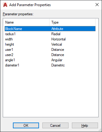 Displays the names of parameters available to add to the block properties table.