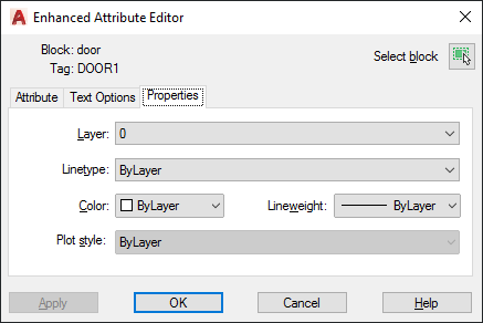 Defines the layer that the attribute is on and the lineweight, linetype, and color for the attribute text. If the drawing uses plot styles, you can assign a plot style to the attribute using the Properties tab.