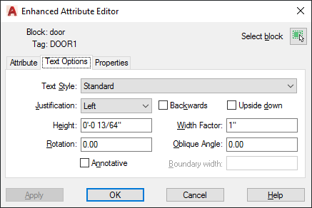Sets the properties that define the way an attribute's text is displayed in the drawing. Change the color of attribute text on the Properties tab.