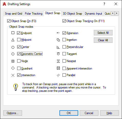 With running object snap settings, also called running osnaps, you can specify a point at an exact location on an object. Press TAB to cycle through the options.