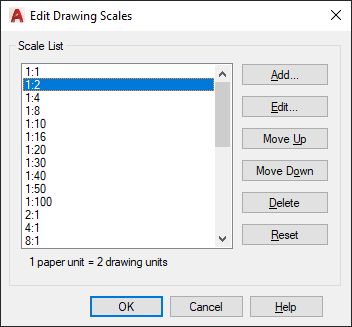 Displays the list of currently defined scales. Also displays temporary scales that are imported when xrefs are attached. If a scale name is duplicated, but has a different value, a number is appended to the name.