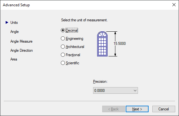 The Advanced Setup wizard contains five pages: Units, Angle, Angle Measure, Angle Direction, and Area. As you work in this wizard, choose Back and Next to navigate between pages; choose Finish on the last page to close the wizard and create the new drawing with the settings you specified.