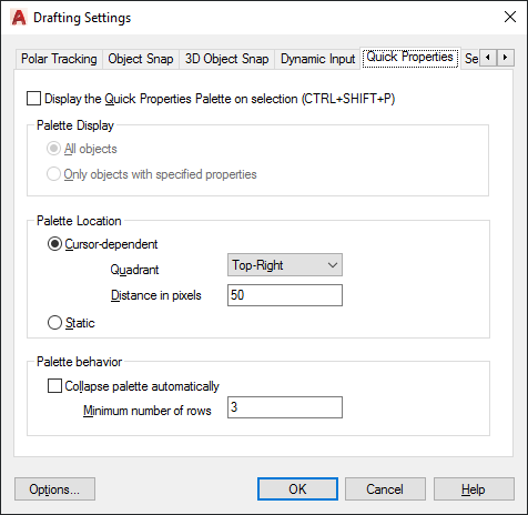 Sets the display settings of the Quick Properties palette. See Customize Quick Properties for more information.