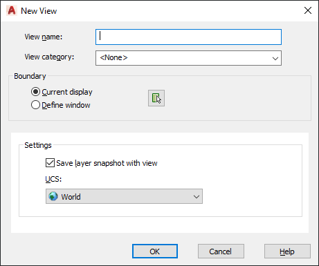 Saves a new, named view from what's displayed in the current viewport, or by defining a rectangular window.
