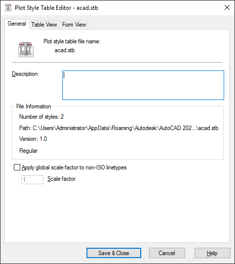 Lists the plot style table file name, description, version number, location (path name), and table type.