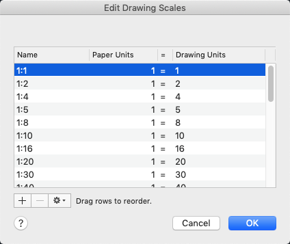 Displays the list of currently defined scales. Also displays temporary scales that are imported when xrefs are attached. If a scale name is duplicated, but has a different value, a number is appended to the name.