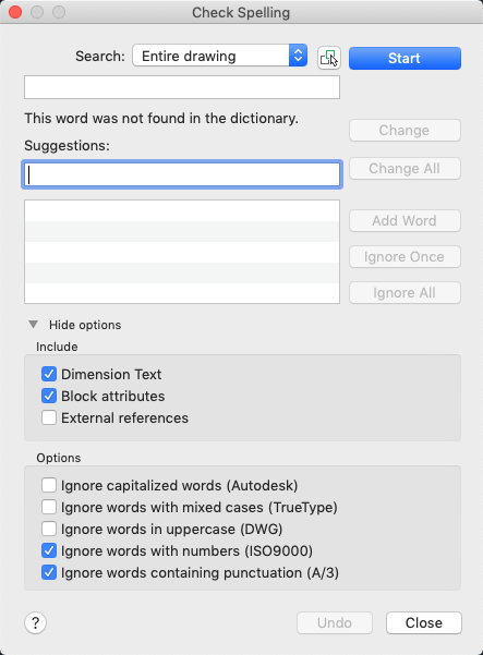 Checks the spelling in single-line text, multiline text, multileader text, text within block attributes, text within xrefs, and text added to dimensions.