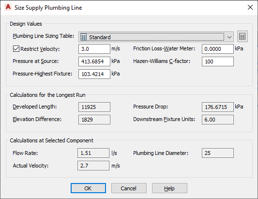 Two sections of the Size Supply Plumbing Line dialog box provide you with final calculations: