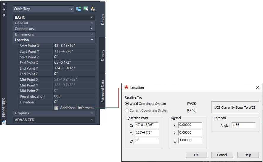 You can view part location information and modify the X, Y, and Z insertion points relative to the current coordinate system and rotation angle of the part. You can also specify elevation, start, mid, and end point values. Location details are available on the properties dialog box for duct or MvParts. For other parts, such as cable tray as shown next, click